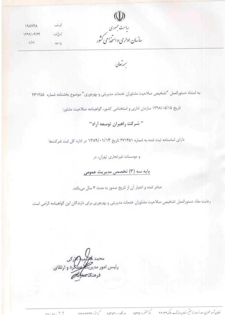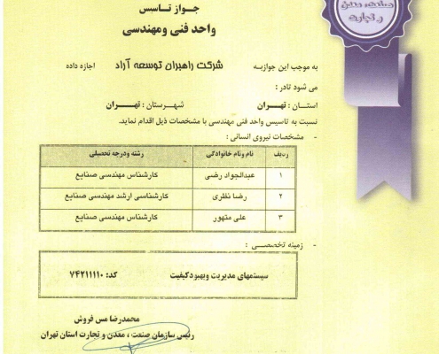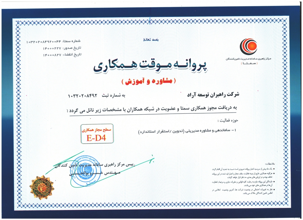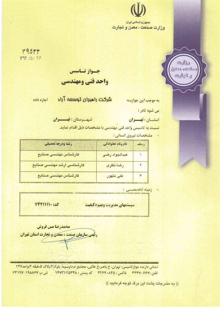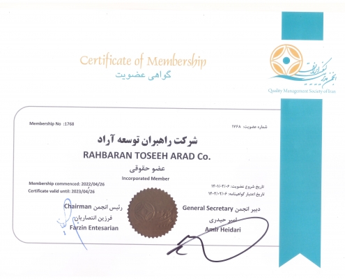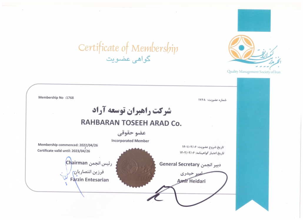 شرکت راهبران توسعه آراد با تعهد کامل به الزامات ملی و بینالمللی، خطمشی خود را بر پایه استانداردهای ISO 9001:2015 و ISO 10002:2018 طراحی کرده است. این رویکرد چارچوبی مؤثر برای ارتقای کیفیت، رسیدگی به شکایات و ایجاد رضایت پایدار مشتریان فراهم میسازد؛ زیرا رضایت مشتریان مهمترین پشتوانه و انگیزه ما برای بهبود و توسعه مستمر است.